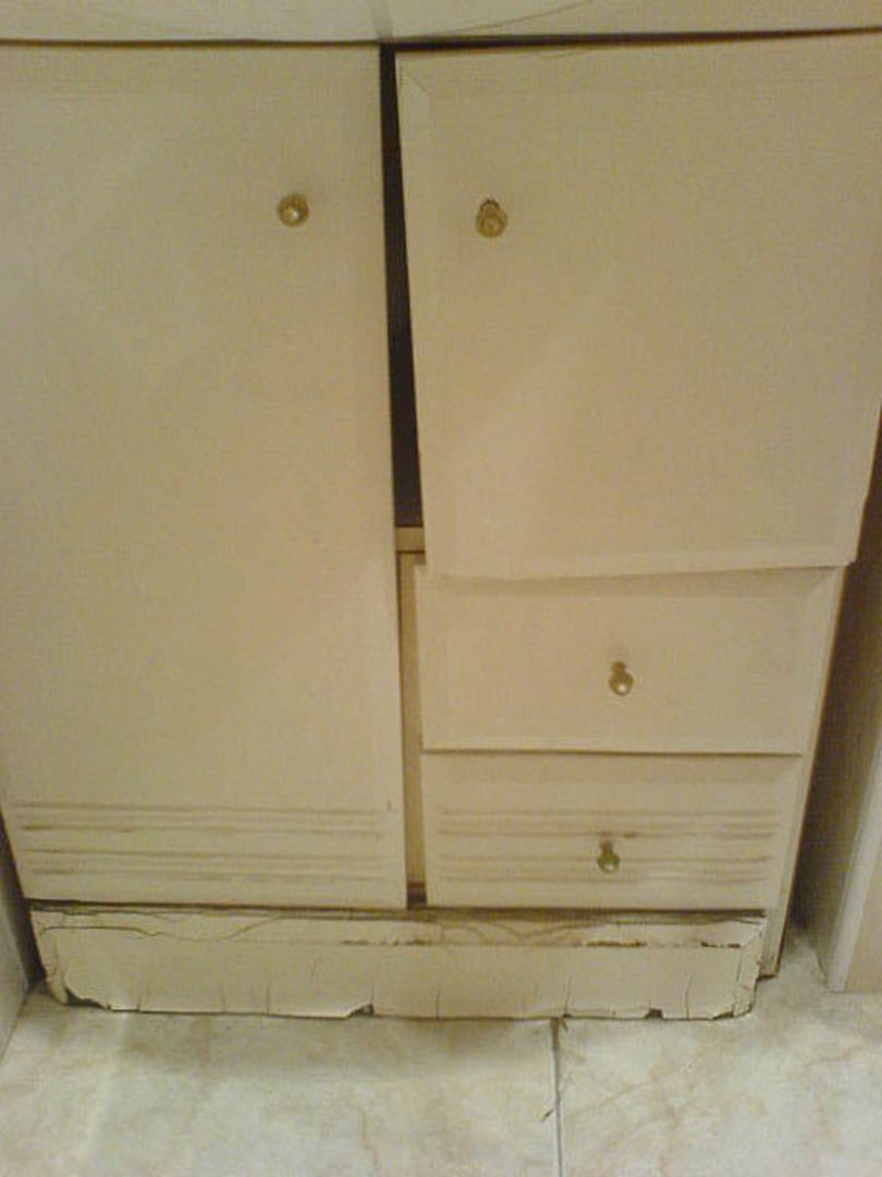 Der Schrank ist total verquollen und im Stadium der Verrottung. Die Türen und Schubladen gehen kaum noch auf, innen ist alles voll Schimmel und Stockflecke.