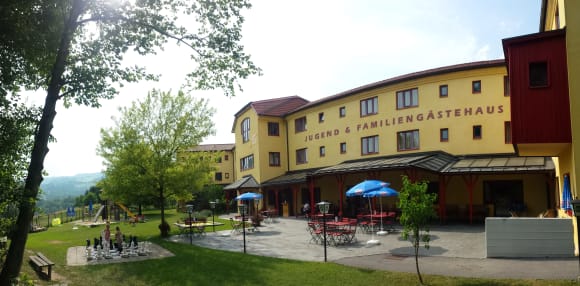 Der Gartenbereich der JUFA mit der Terrasse auf der das Frühstück und Abendessen eingenommen werden kann. Zu sehen ist auch das Outdoor-Schach und der Spielplatz im Hintergrund.