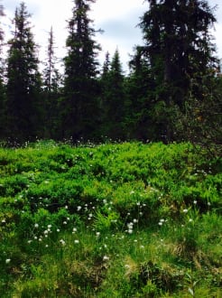 Wunderschöne Landschaft mit Farnen, Heidelbeeren, Preiselbeeren und Wollgras