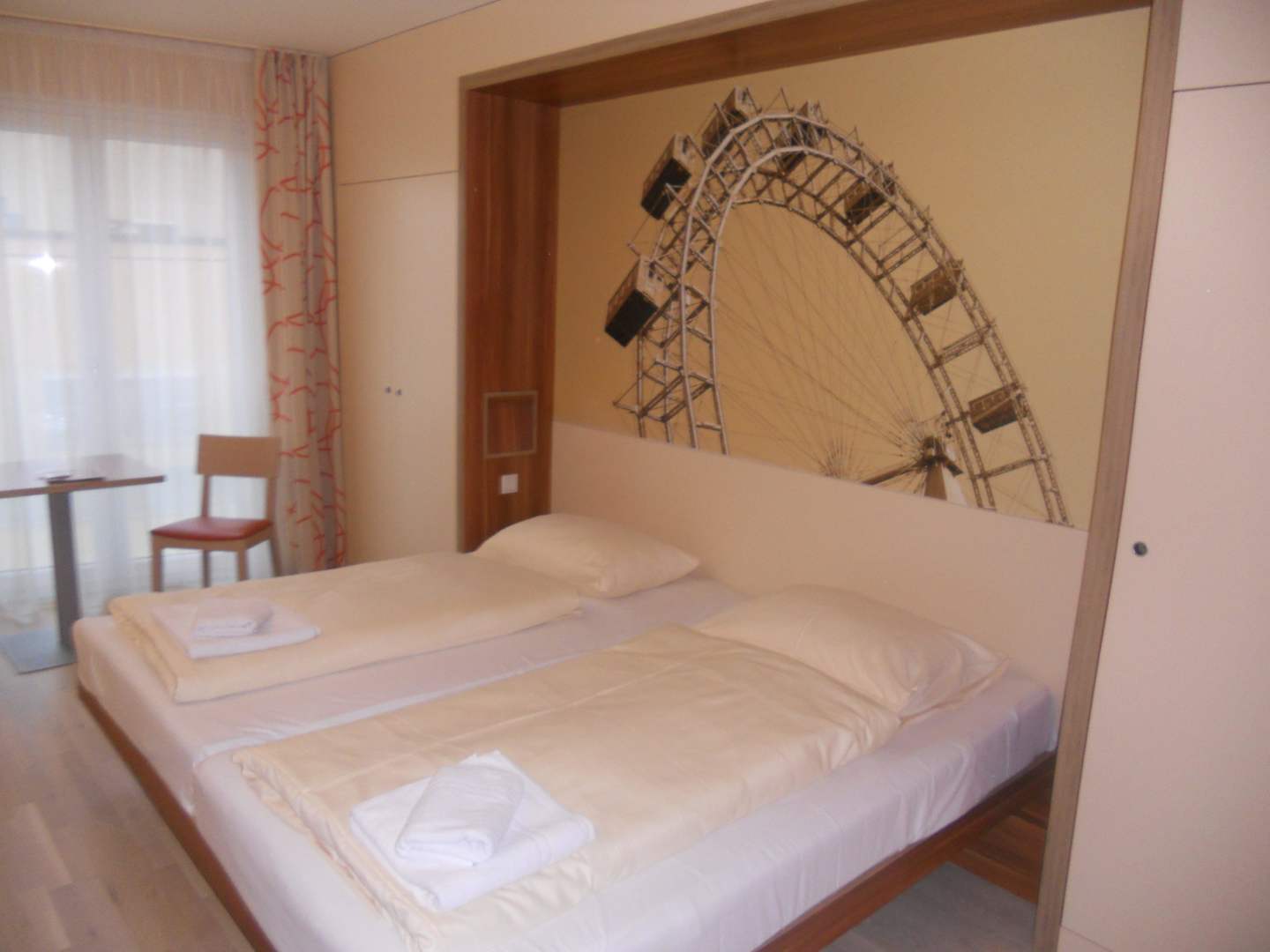 Bett mit Handtüchern, und Riesenrad