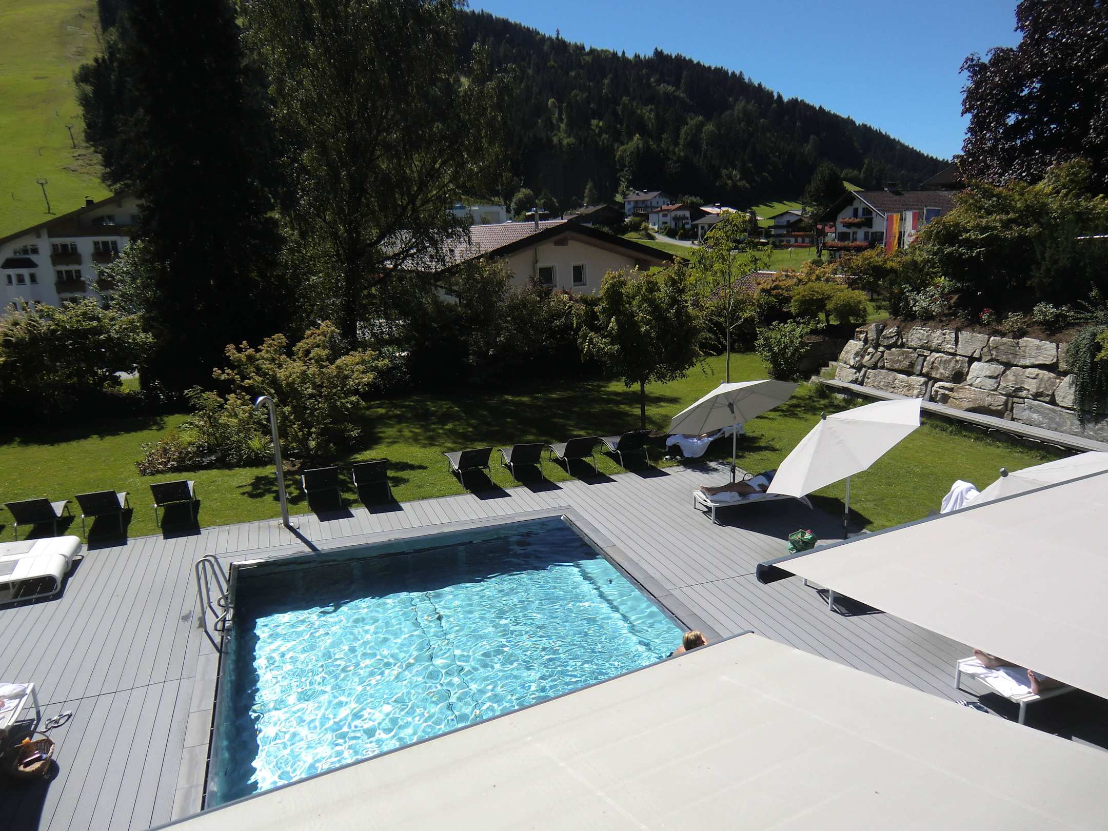 Blick von der Terrasse auf den Pool