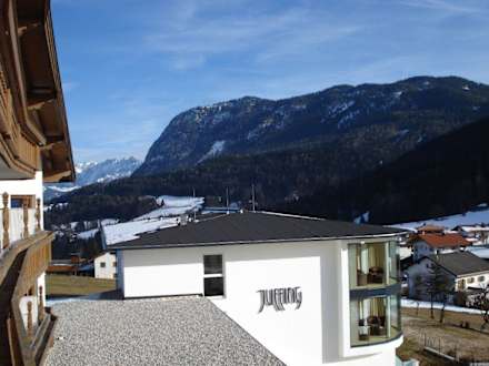 Blick vom Haupthaus über das neue Gebäude in Richtung Wilder Kaiser