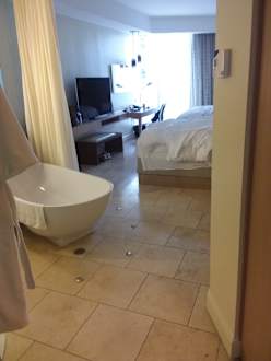 ZimmerFreistehende Badewanne, die dezent mit grünem Licht umleuchtet wird, damit man nachts nicht dagegen läuft. Ist auch nicht störend in der Nacht.