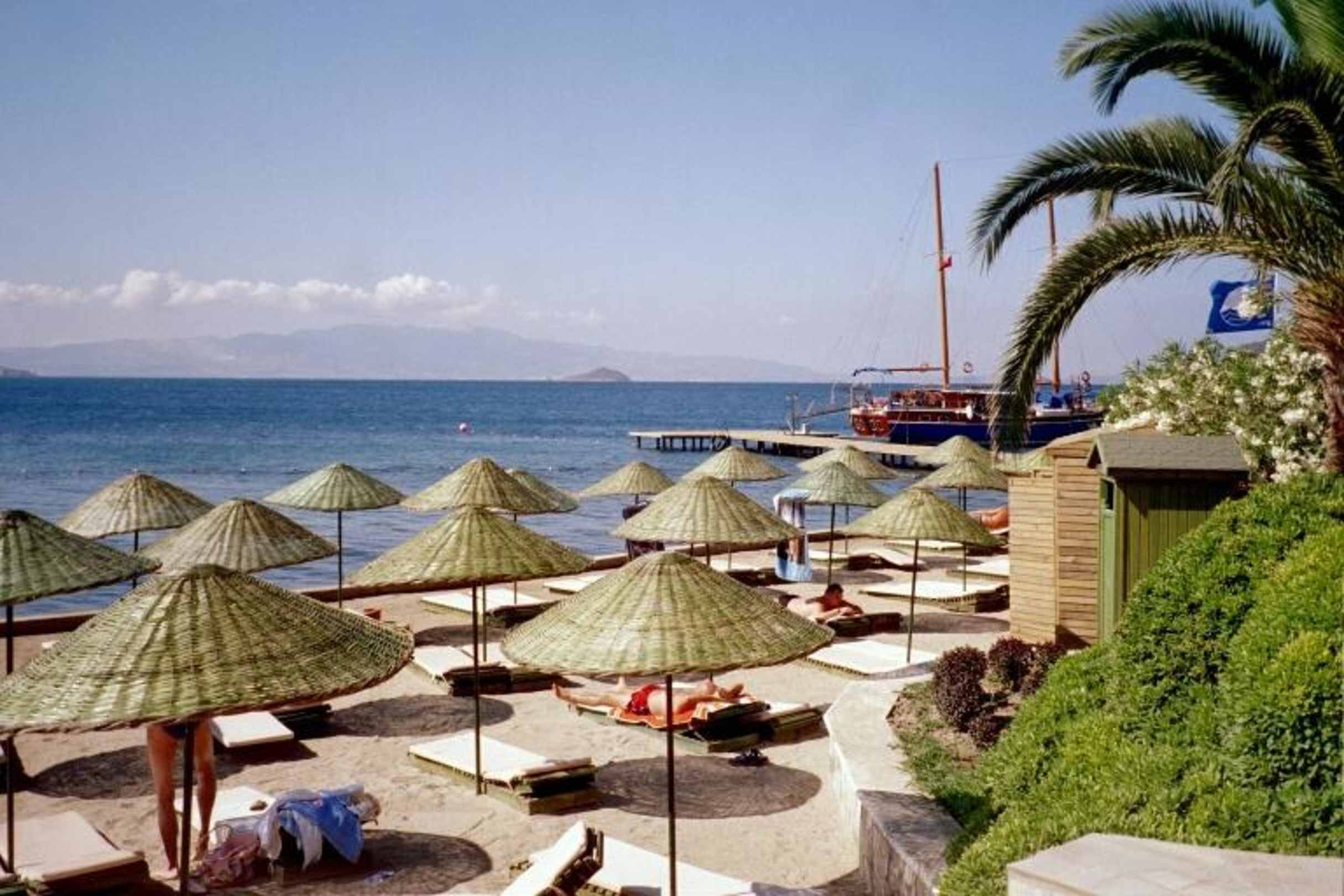 Das ist der künstlich angelegte Strand; Die Schirme sind allerdings schon in die Jahre gekommen