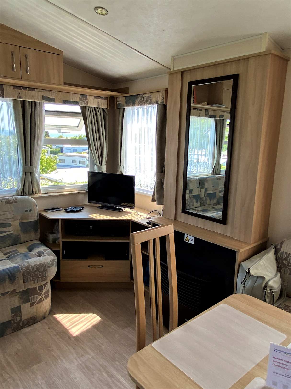 Wohnraum mit Ausblick, Essecke und TV.
