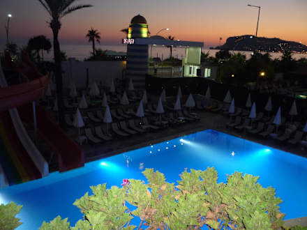 Výhled z terasy restaurace na bazén, moře a pevnost