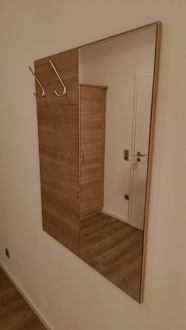 Kleidungshaken und ein großer Spiegel.