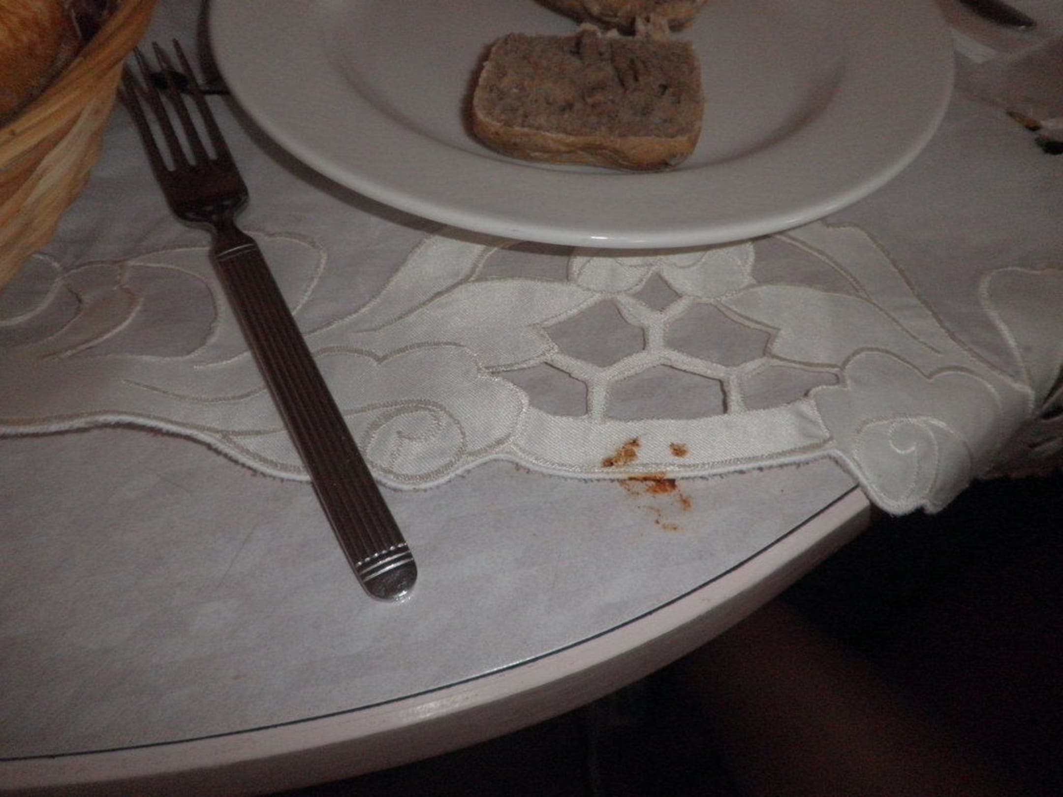 Essensreste vom Vortag noch am Tisch bezieht sich auf das Tischtuch und auf die Tischplatte