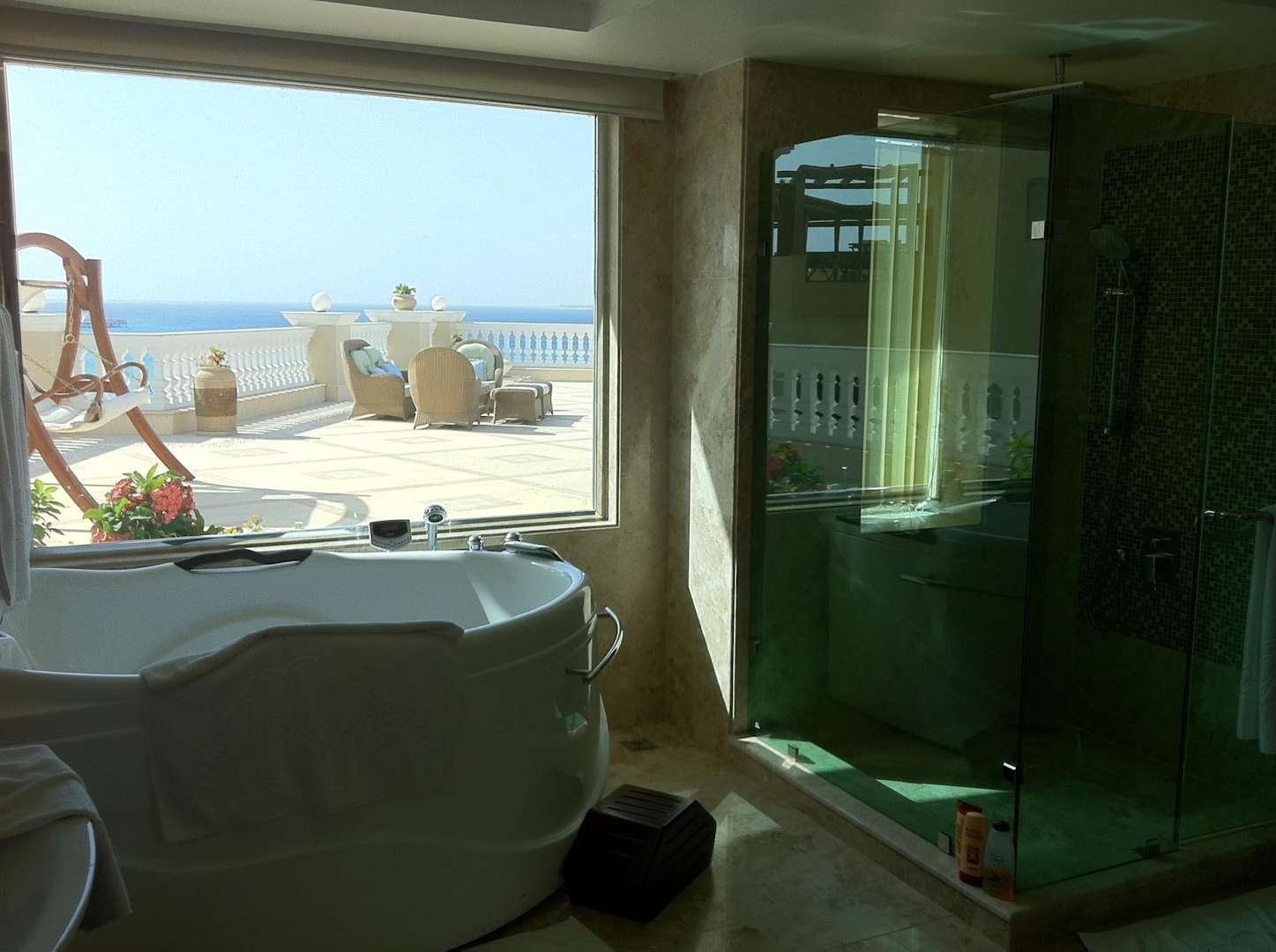 Bad mit Regendusche und Traumausblick