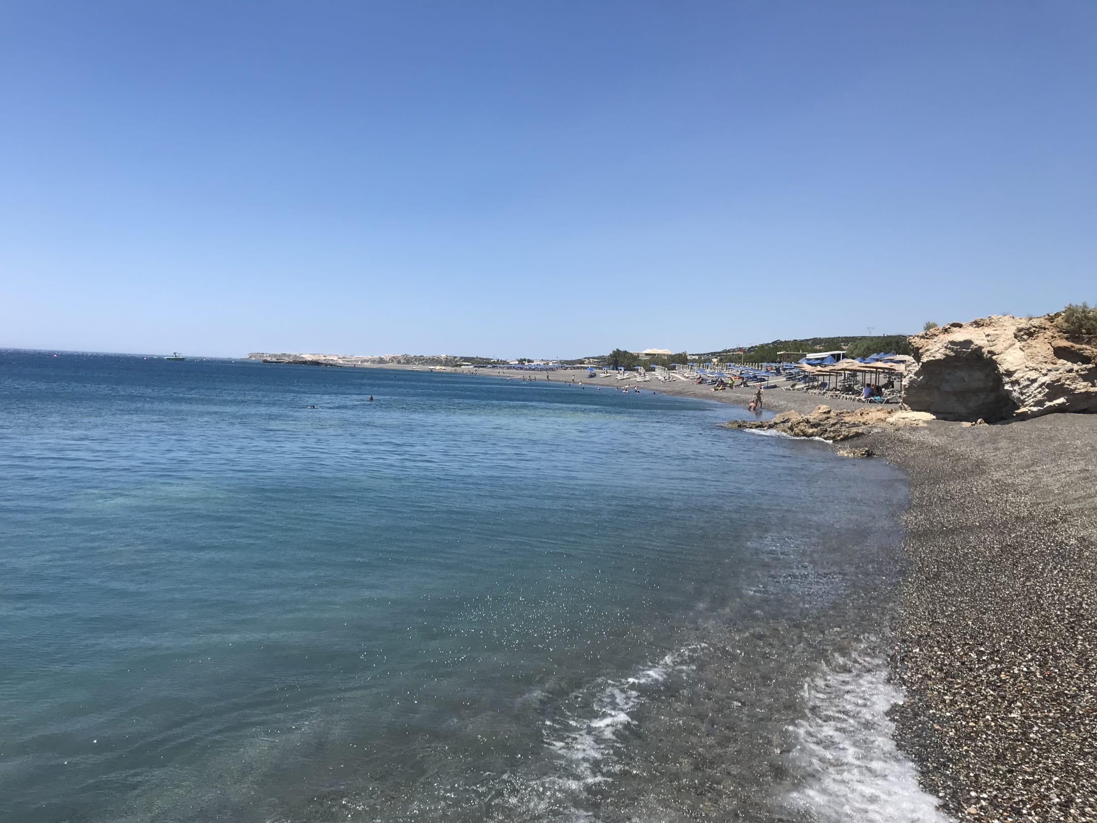 Der tolle Kiesstrand. Jedoch ist anzumerken, dass auf Kreta lt. Auskunft vom Manager alle Strände öffentlich zugänglich sein müssen, und daher werden die Liegen und Schirme auch von den Einheimischen genutzt.