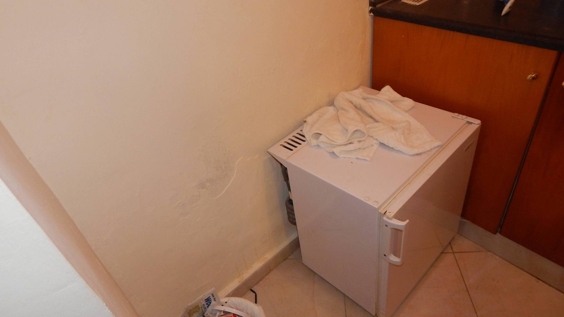so sieht der Kühlschrank und die Wand in der „Küche“ aus