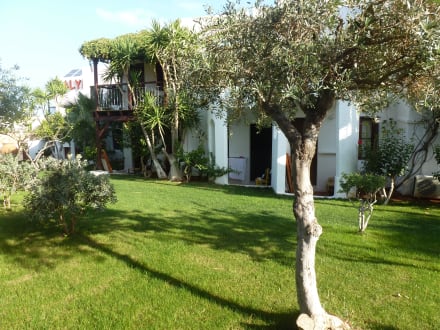 Kleiner Garten hinter den Zimmern. Da die Balkone im Erdgeschoss eher klein sind, kann man die Wiese mitnutzen und bekommt auch Liegestühle dazu.