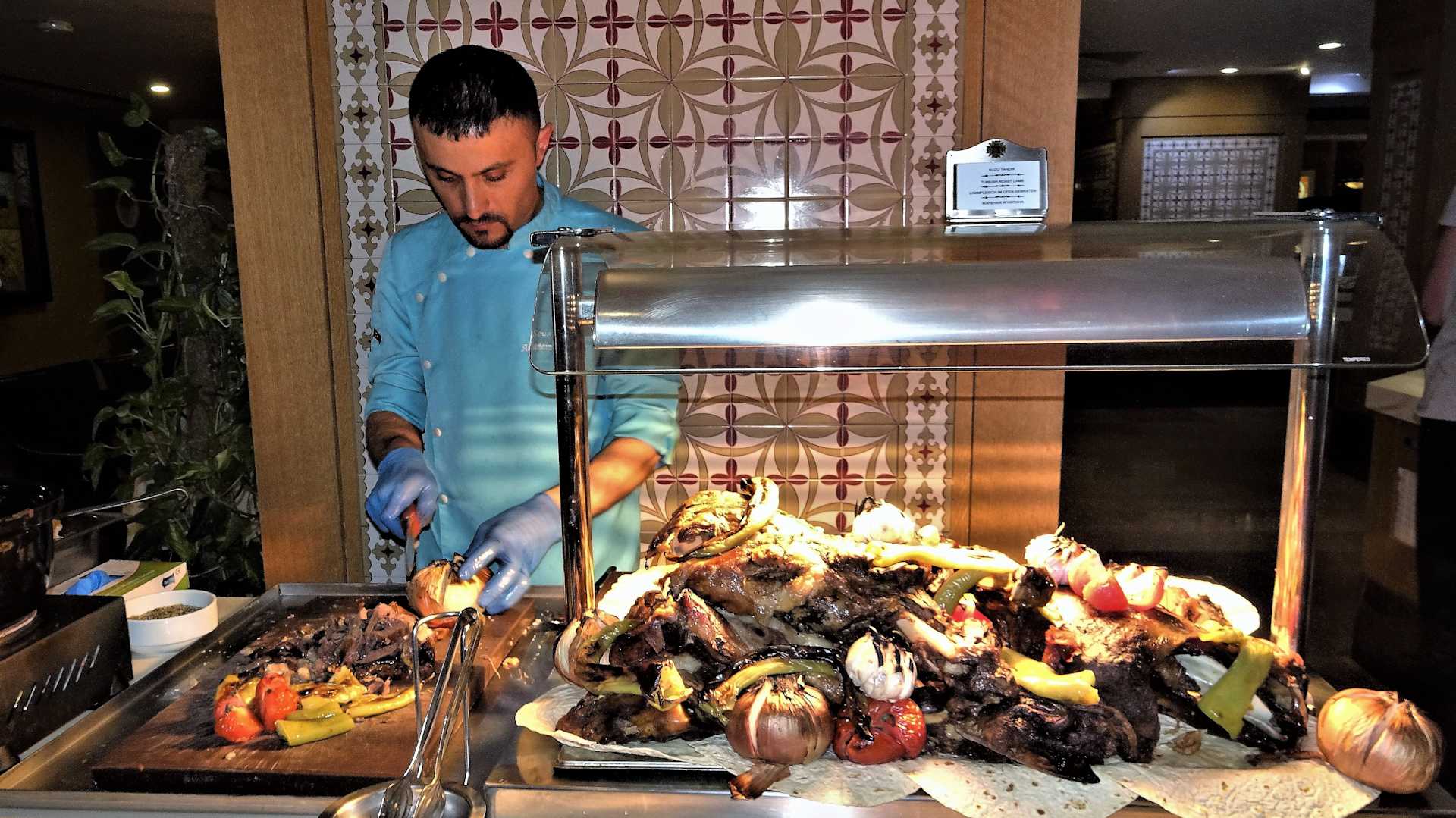 Der Koch zerteilt ein Lamm.