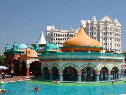 vorne eins der Pools, dahinter ein Restaurant