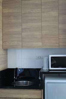 Spüle mit Mikrowelle, Wasserkocher, Kühlschrank