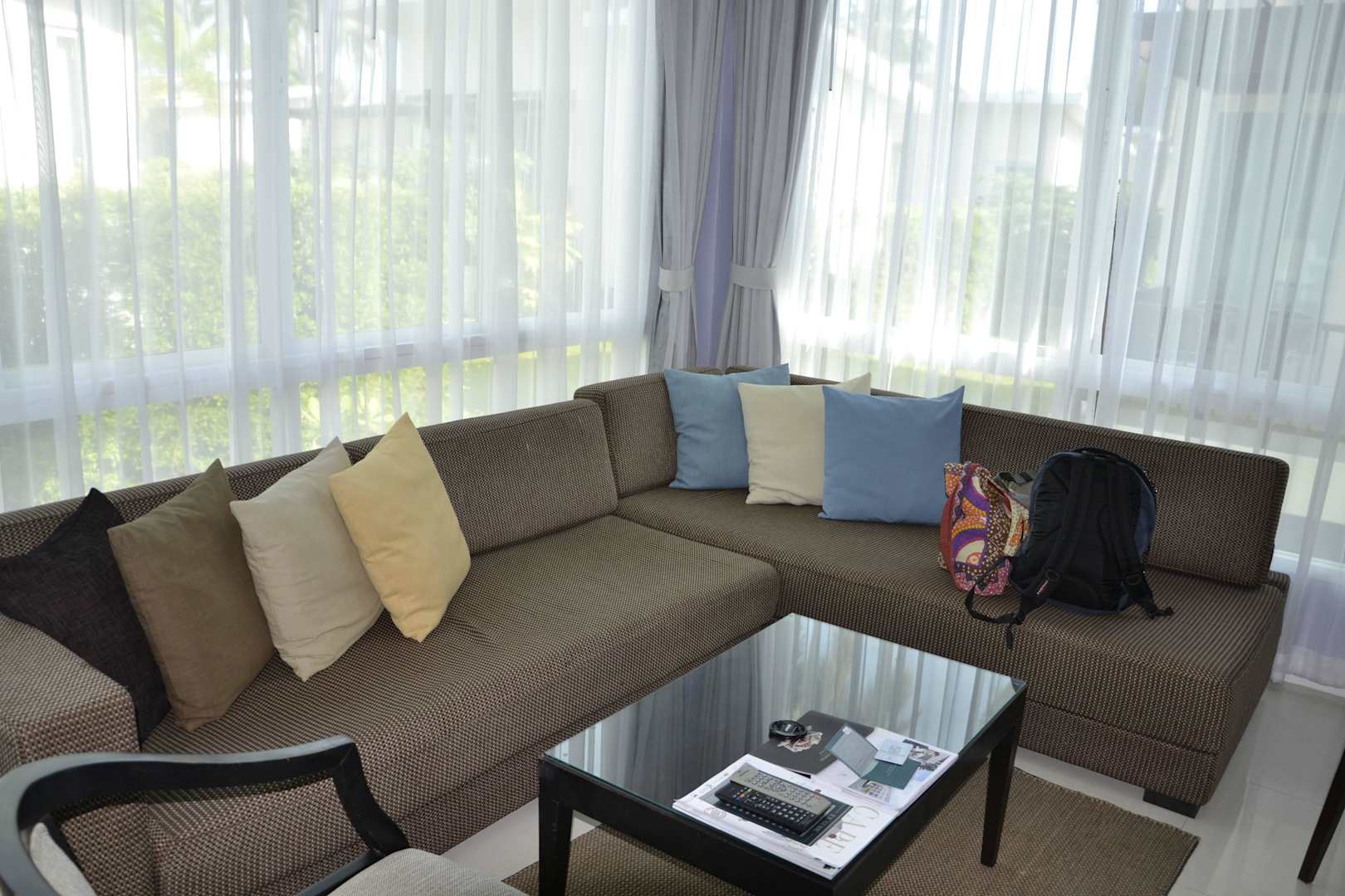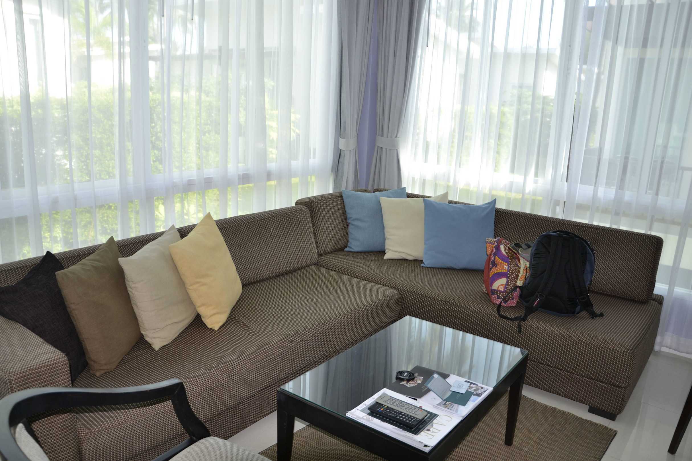 Das Sofa und der Rest der Einrichtung sieht gemütlich und modern aus. Bei genauem hinschauen, ist die gesamte Einrichtung jedoch schon gut abgelebt.