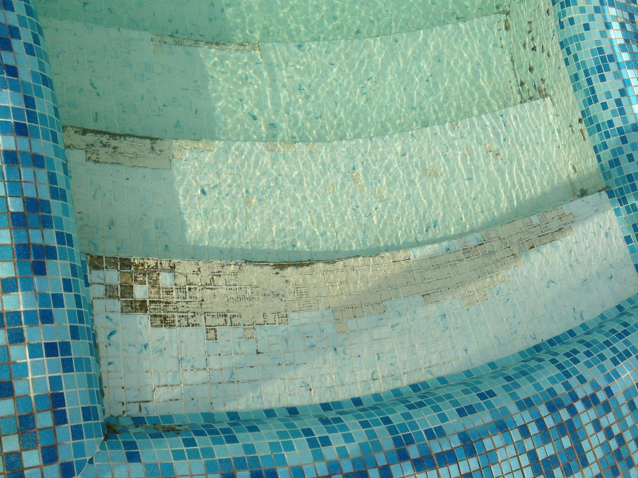 Alter & brüchiger Pool mit losen Mosaikfliesen