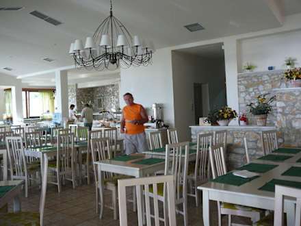 Speisesaal vom Hotel Kassandra Bay in Skiathos Stadt -Griechenland. Im Hintergrund das bescheidene Buffet. Aber wie schon in der Hotelbewertung erwähnt, befinden wir uns eine Woche vor Saisonschluß. Daher auch kaum Gäste.