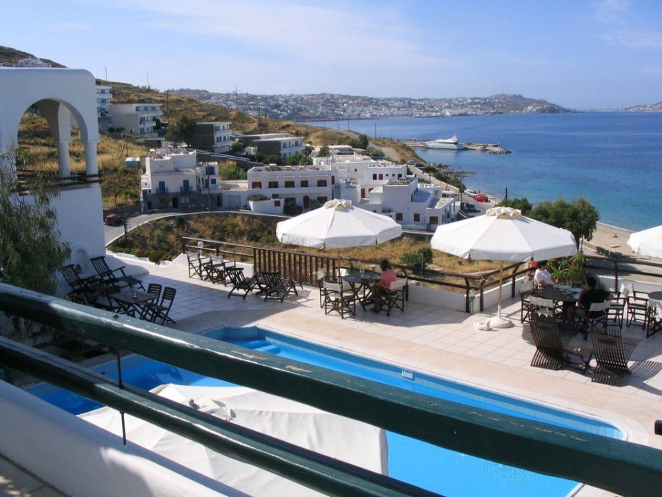 Aussicht auf die Dachterasse im 3. Stock mit dem Pool und auf die Bucht von Mykonos Stadt / Chora. Zu sehen ist auch die Anlegestelle der grossen Kreuzfahrtschiffe im neuen "Hafen".