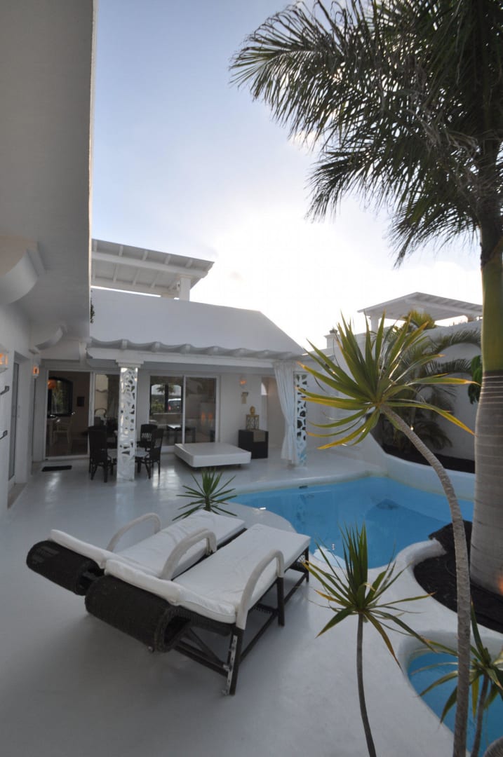 Privater Pool mit Liegen, Palme und Zugang zu den anderen Schlafzimmern. Die Villa ist um diesen Hof herum organisiert - 2 Zimmer erreicht man von hier aus, die anderen haben große Schiebetüren zum Hof.