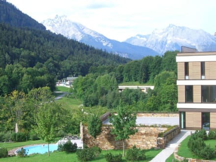 Blick vom Balkon 3. Stock mit Hotel am Rand und dem Außenpool, Bildmitte links das Museum Obersalzberg mit der Busstation. Hinten Berg Hochkalter ggü Berchtesgaden