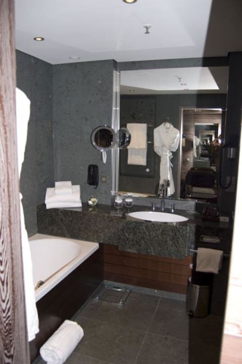 Badezimmerlinks die Wanne, vorne der Waschtisch, rechts sind die Glastüren zur Dusche und zum WC (nicht auf dem Bild zu sehen)