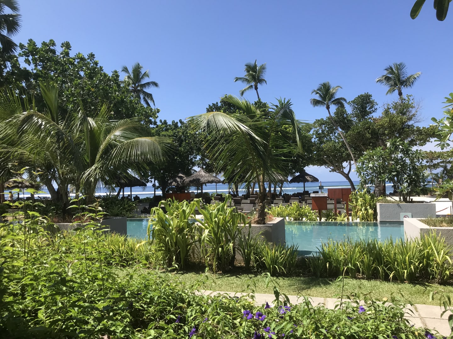 Blick vom Frühstückstisch über den Pool zum Strand