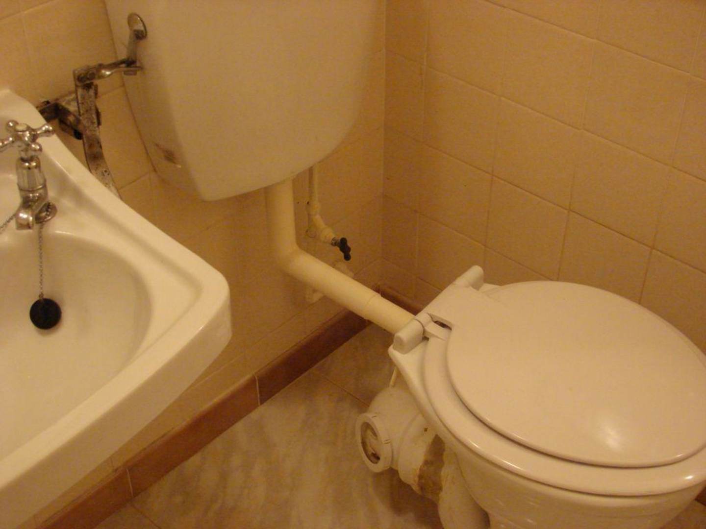 Die altertümliche Toilette mit der rostigen Henkelvorrichtung zum Spülen.