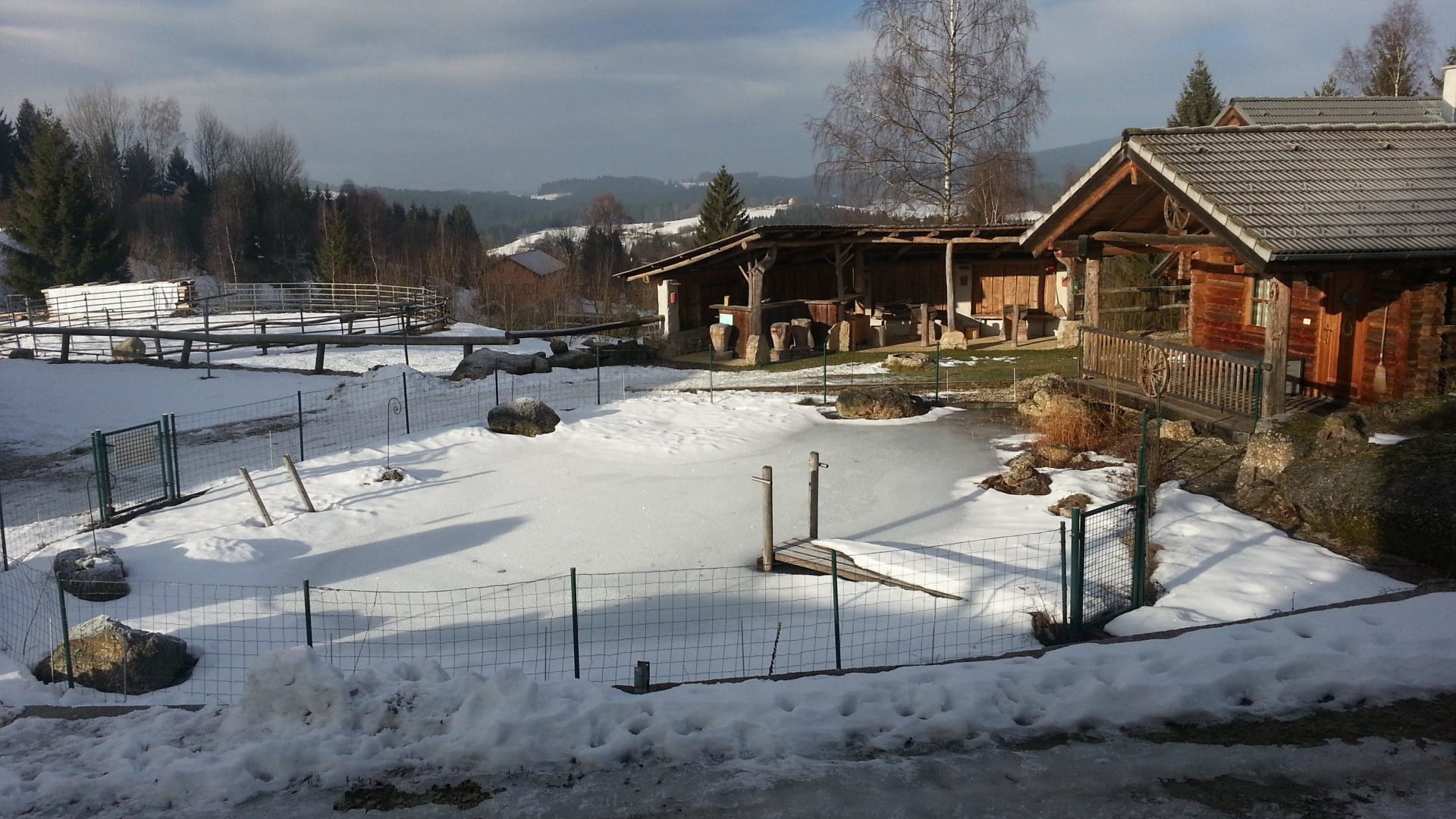 Blick vom Wellnessbereich zum gefrorenen Teich