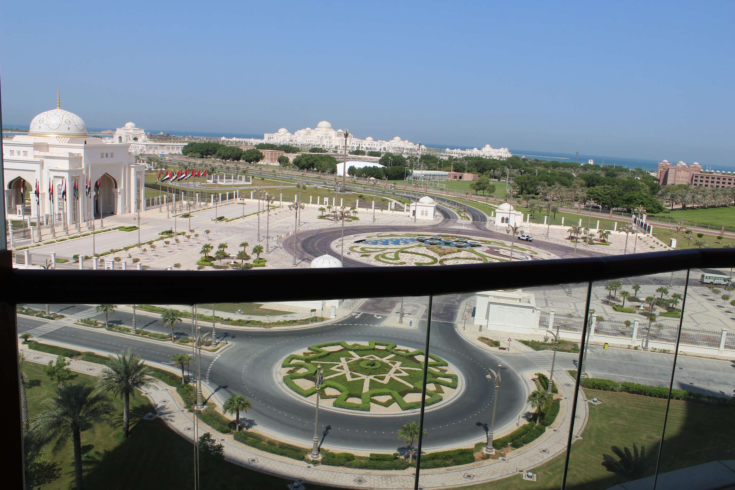 Ausblick vom Zimmer auf das Präsidentenviertel (links) und Emirates-Palace (ein Stück rechts).