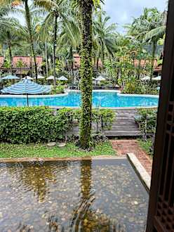 Ausblick vom Frühstück auf die Poollandschaft