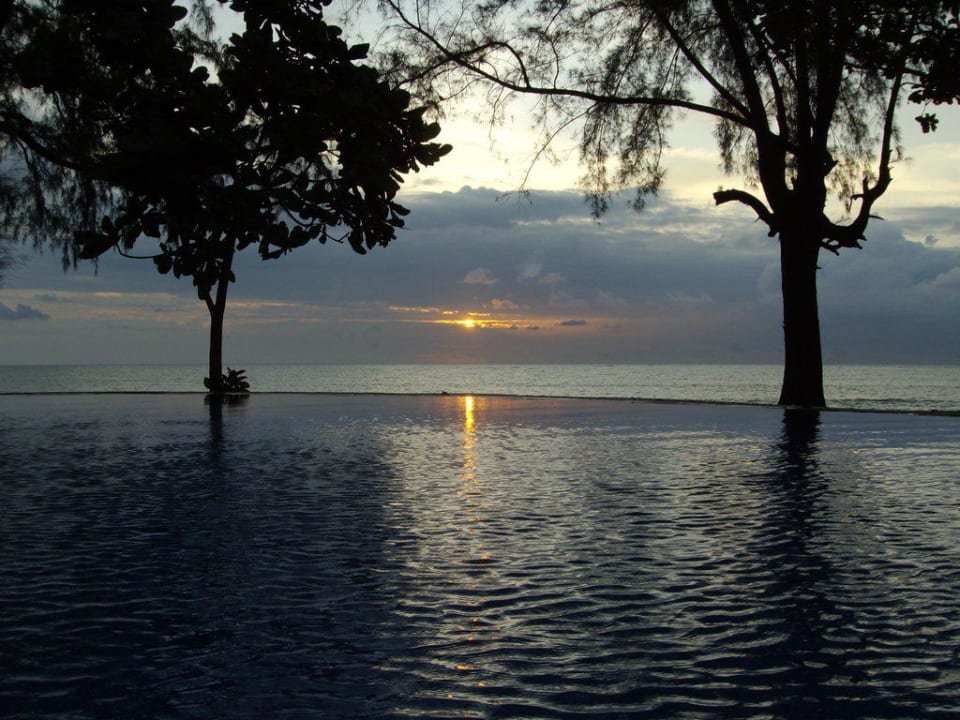 Blick vom Pool zum Meer mit Sonnenuntergang