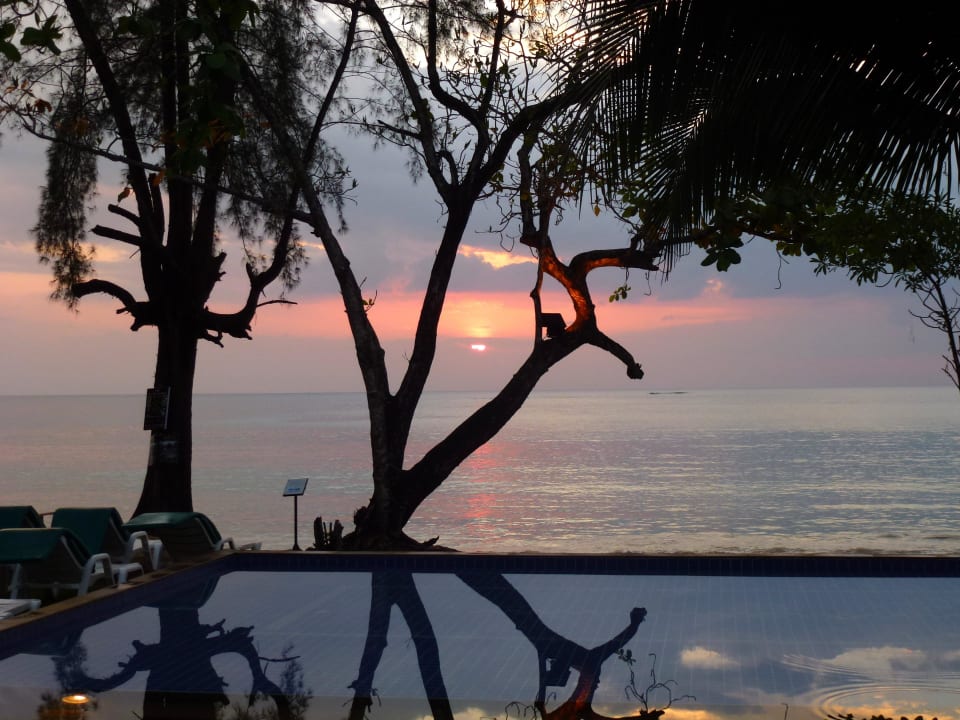Pool und Meerblick beim Sonnenutergang