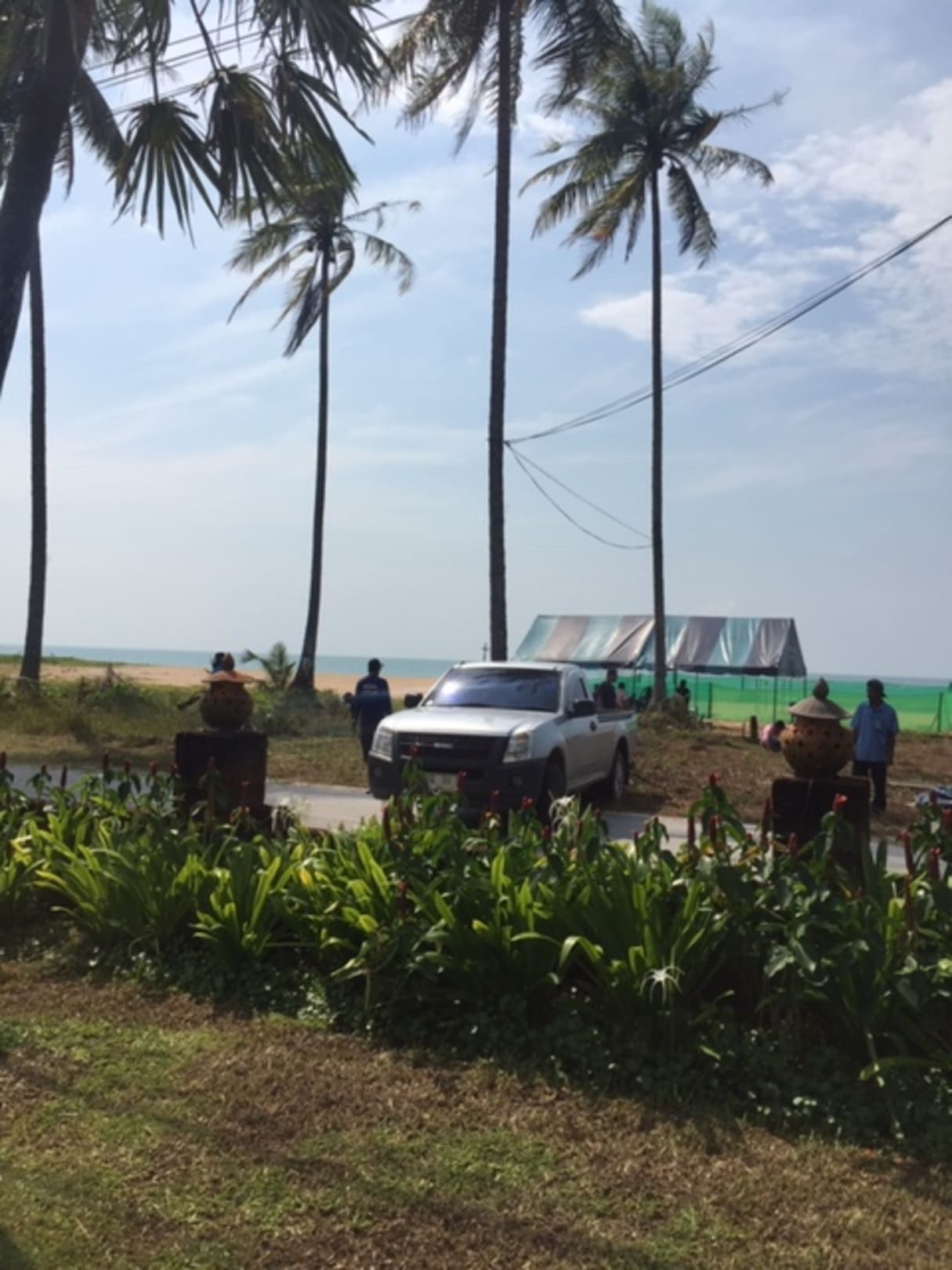 AusblickBlick von der Sonnen-Liege nun nicht mehr auf den schönen Strand sondern auf wendene Autos und Bauarbeiter