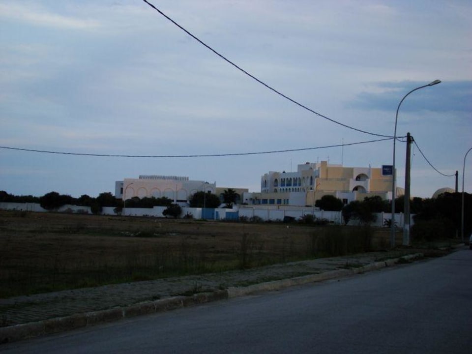 Widok od strony ulicy wjazdowej do hoteluDO hotelu prowadzi droga z jej lewej strony jest puste brudne i smierdzace pole
