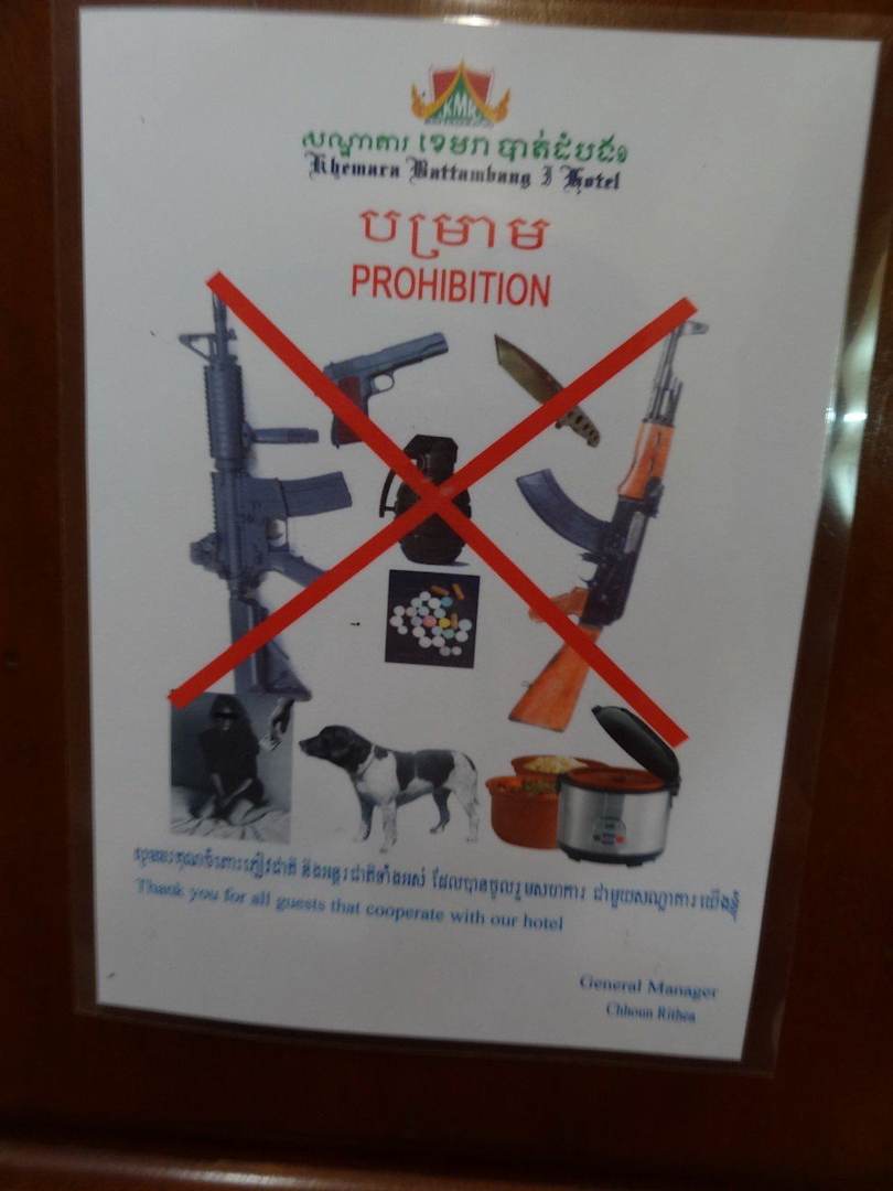 Objets interdits !Interdits d'emmener en chambre Fusit d'assaut, révolver, friteuse electrique, chien, prostituée, et grenade !