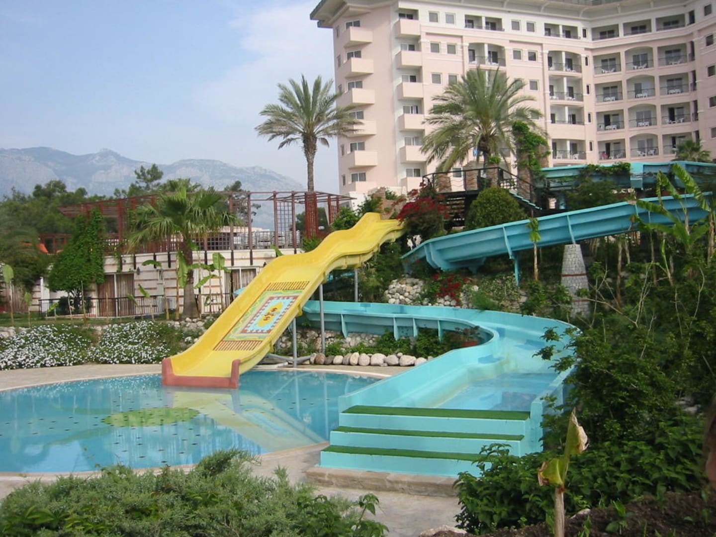 Wasserrutsche mit Hotel im Hintergrund