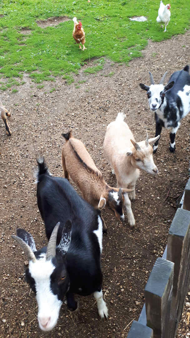 Es gibt 7 Ziegen auf dem Bauernhof der Familie Höcker. Die Ziegen leben zusammen mit Hühner in einem großen Freigehege. Hier können die Kids rein, die Ziegen füttern, streicheln und beobachten