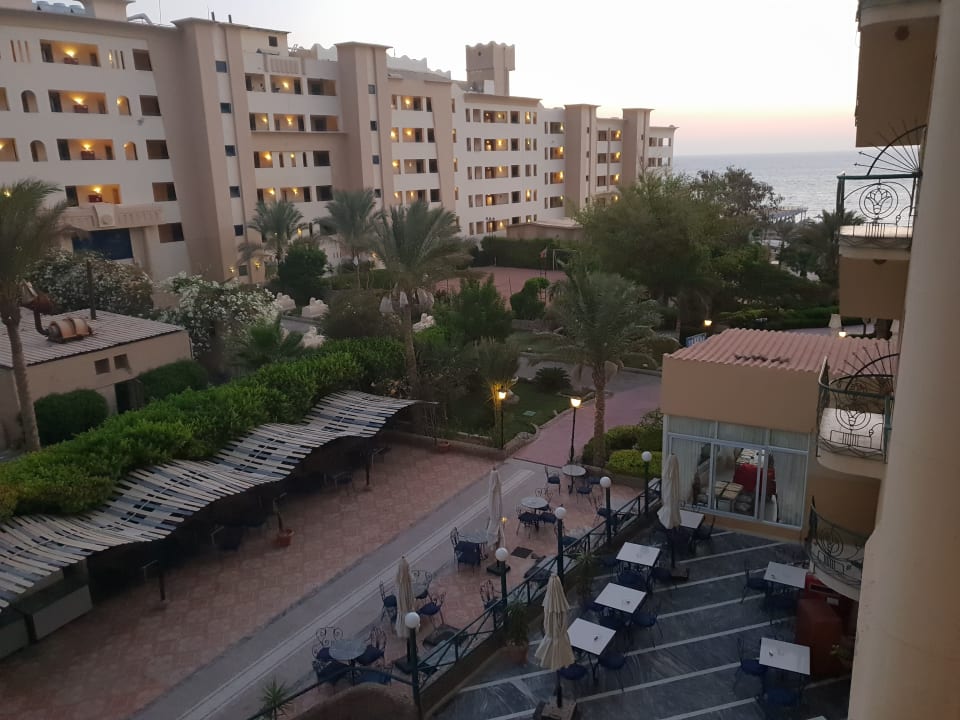 Blick vom Balkon auf Außenansicht Restaurant und Weg zum Strand