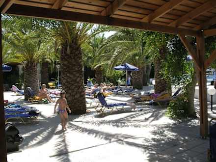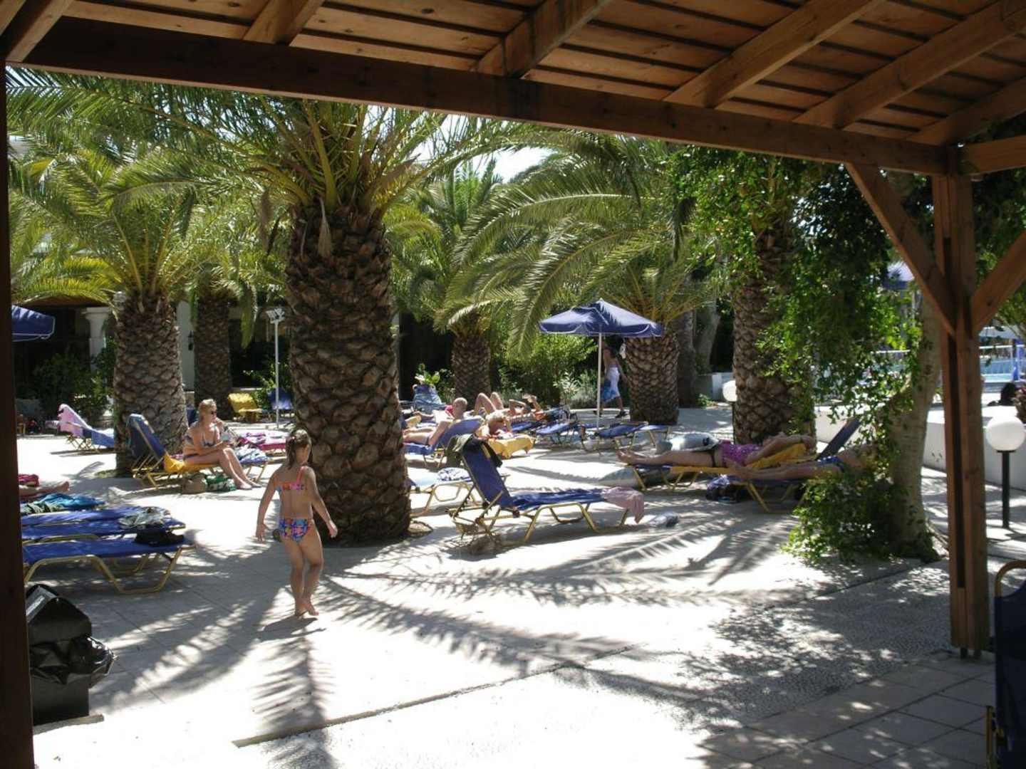 Liegefläche zwischen Restaurant und Pool