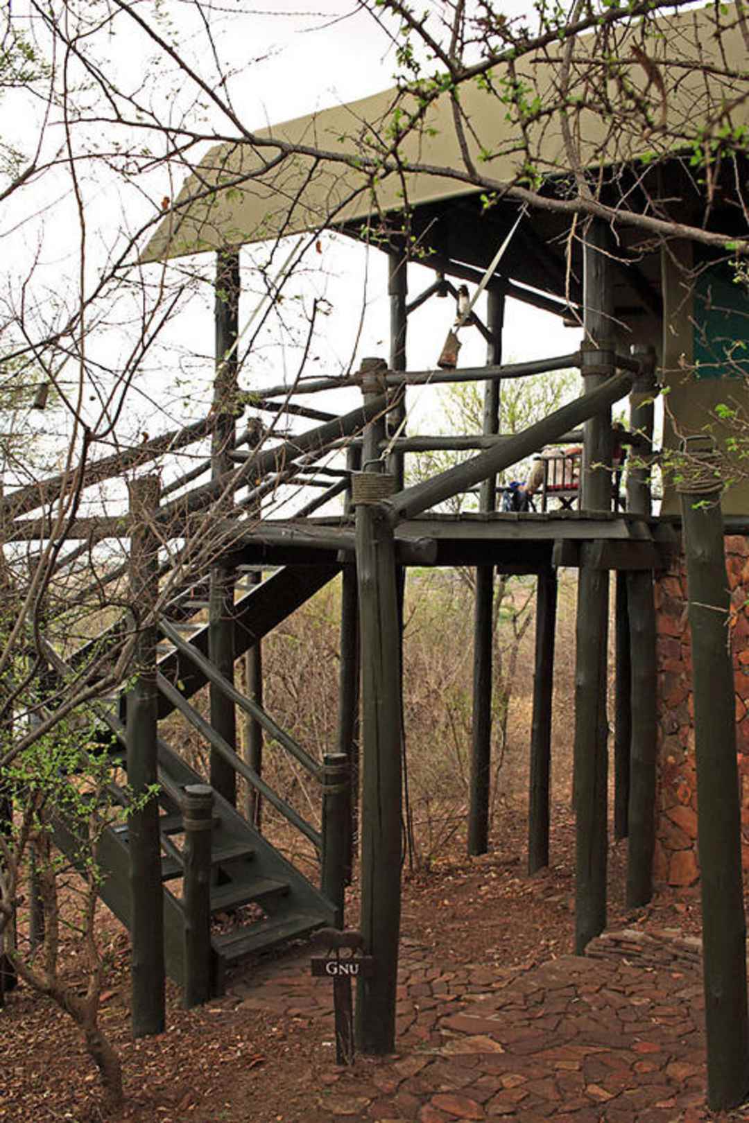 Das Zelt Nummer 8 liegt hangabwärts und ist über einen gepflästerte Natursteinweg und Treppenstufen gut zu erreichen. Vom Deck geniesst man einen guten Ausblick in die unberührte Wildnis und die tiefer liegende Ebene.
