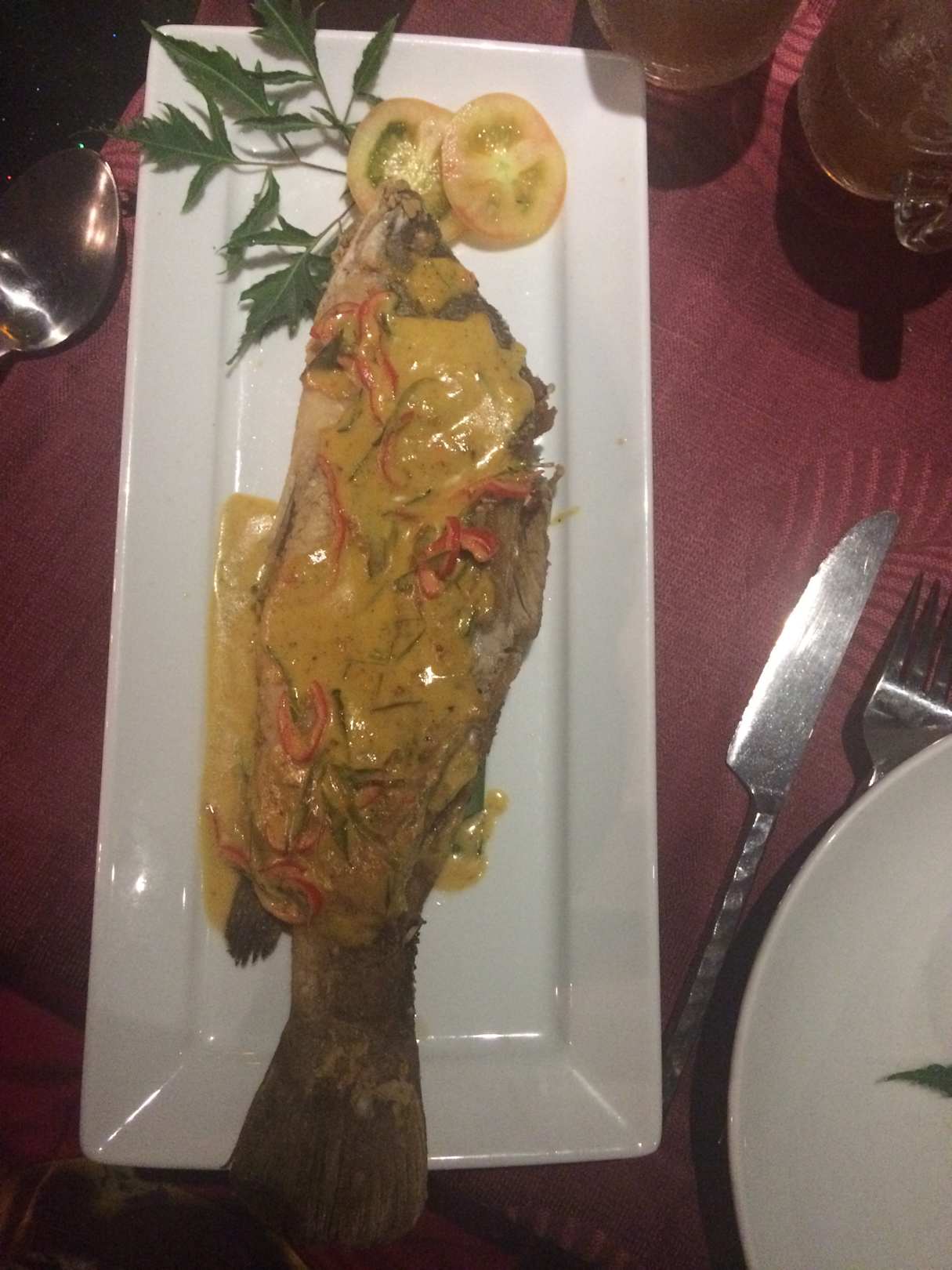 Whole Sea Bass mit roter Curry Soße, sehr lecker, dazu wird Reis serviert 350 Bhat (03/2018)