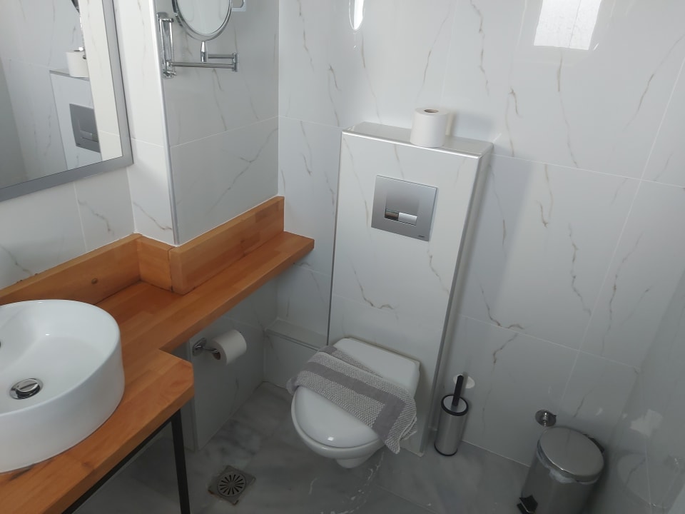 Bad im Mini DZ, es gibt nicht mal etwas zum Handtücher aufhängen oder ablegen, nichts!!!