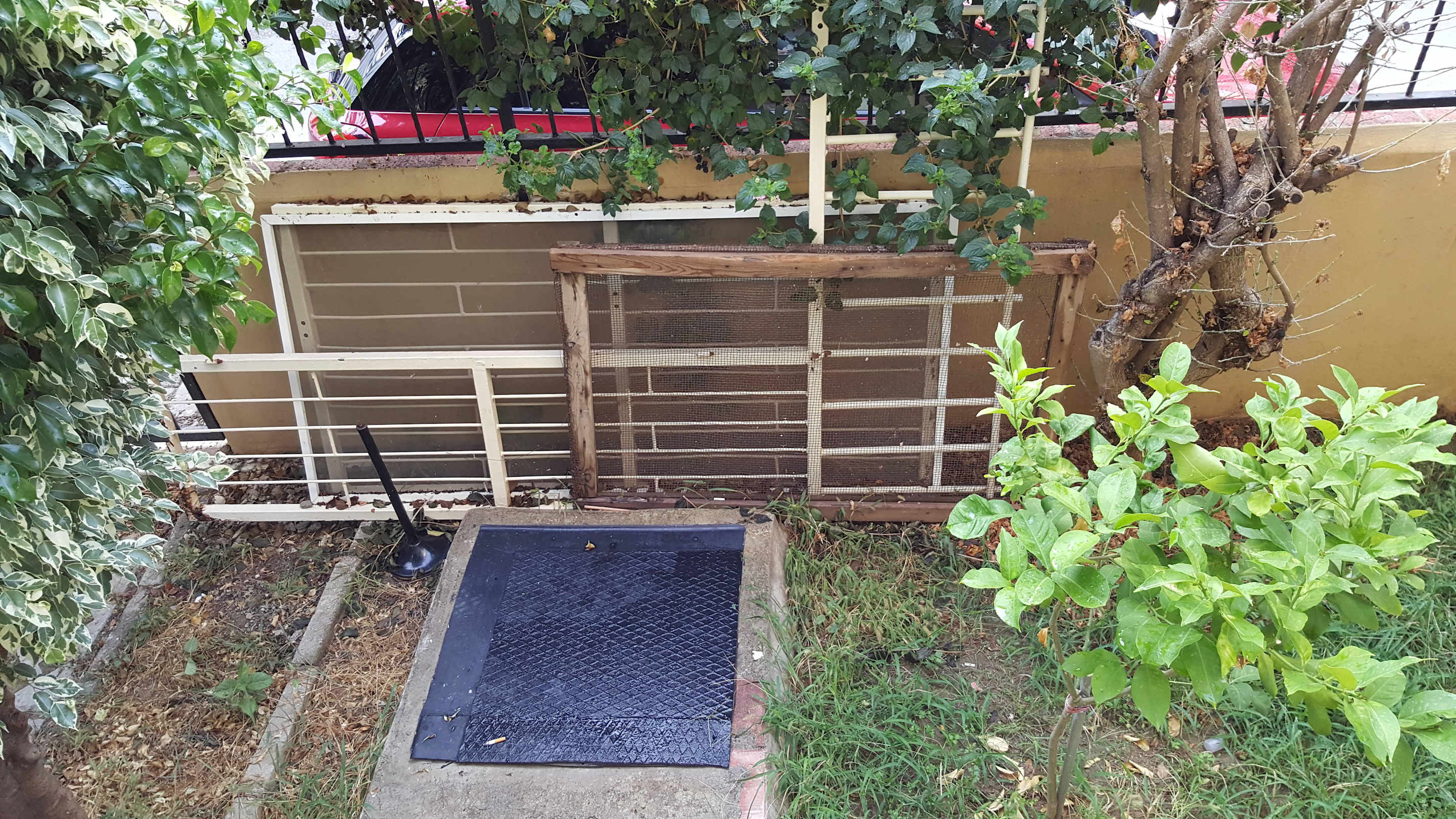 war der blick vom Balkon,ein ungepflegter vorgarten.
