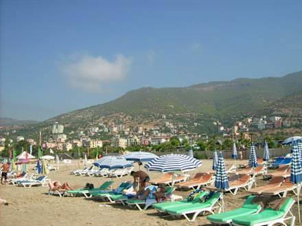 Strand und die Berge im HintergrundReichlich liegeplätze zu super Preisen. 4,50 Euro für 2 Liegen + Sonnenschirm.
