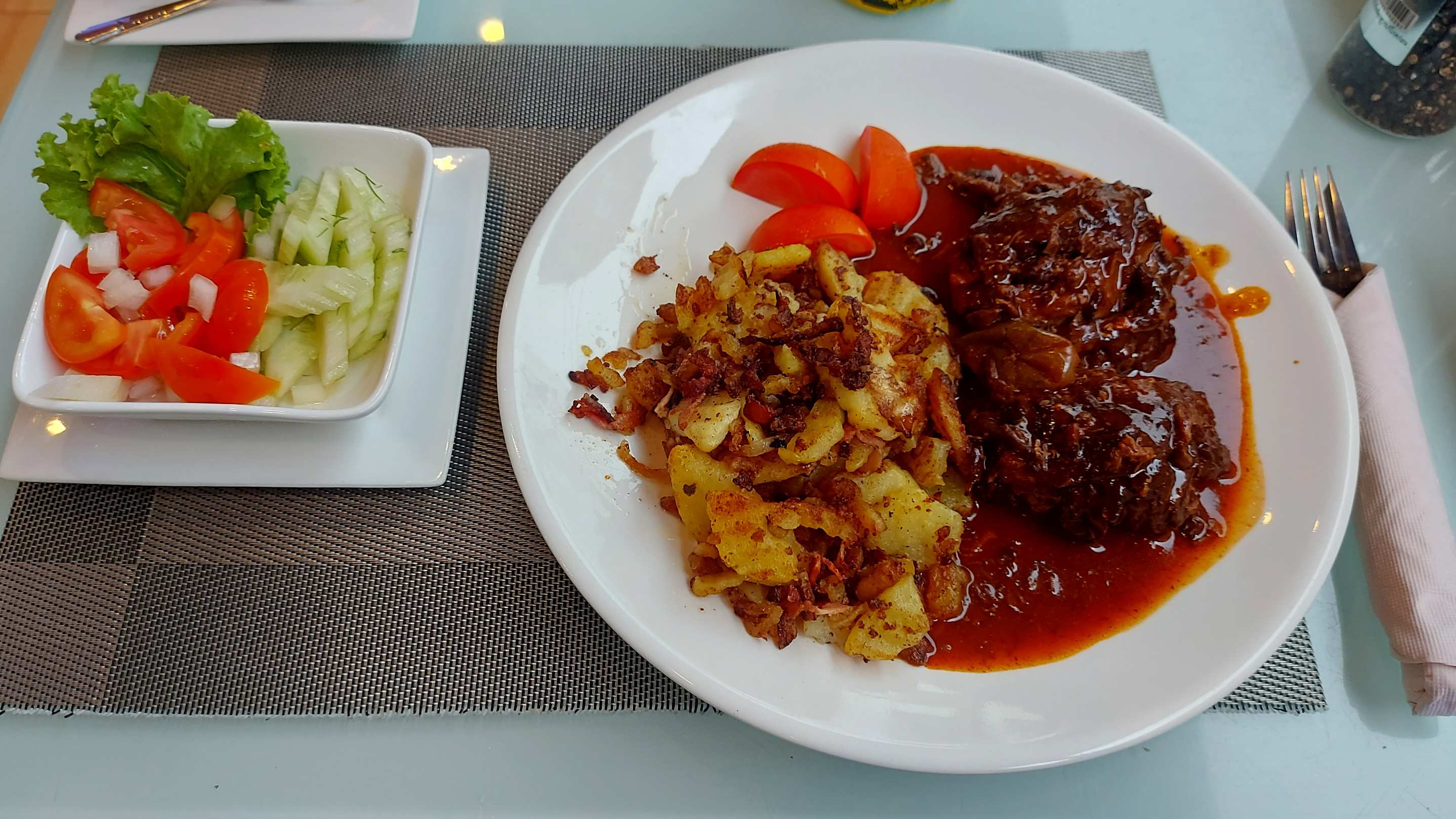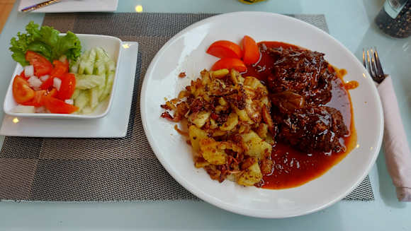Rinderrouladen mit Bratkartoffeln und Salat.