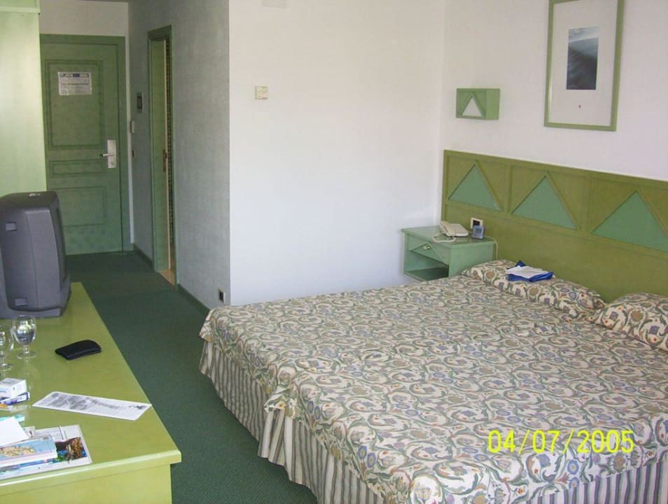 DoppelzimmerZimmeransicht vom Fenster aus mit Bett, Sideboard mit Fernseher, zwischen Sideboard und Eingangstür stehen die Kleiderschränke