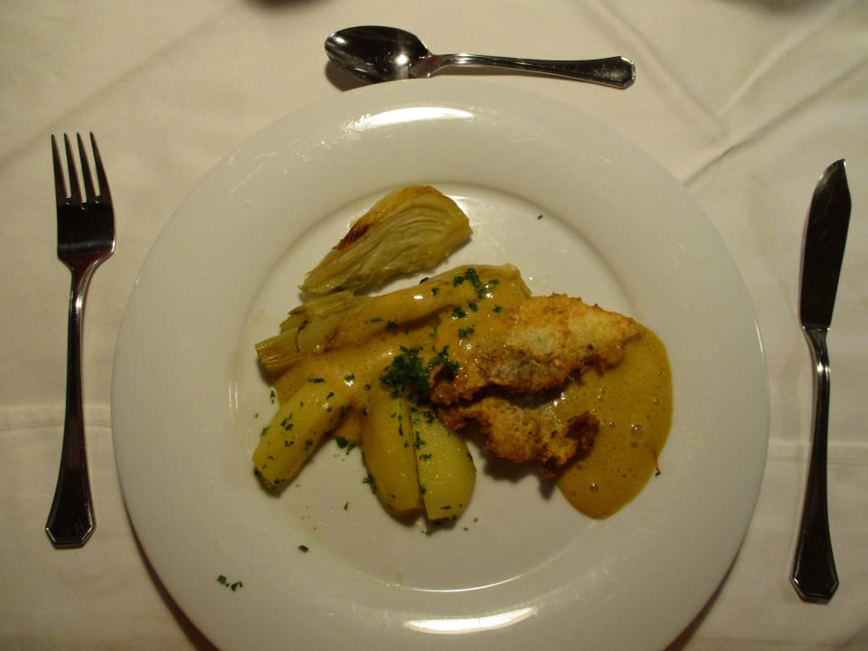 Normales MenüGebratenes Zanderfilet in Kräutereihülle mit feiner Safran-Soße, frisches Fenchelgemüse und Petersilienkartoffeln