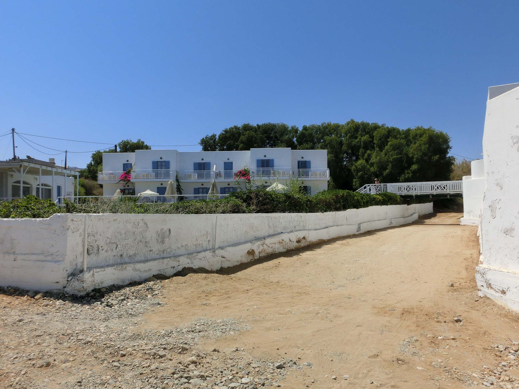 Blick auf Haus mit Familienzimmern und altem PoolBlick auf Haus dem den 12 Familienzimmern. Über diesen Steg gelangt man zu diesem sep. gelegenen Haus. Davor liegt der abgewrackte und alte Pool. Rechts daneben dann die Poolbar in der bis 1.30 Uhr jede Nacht Discomusic läuft.