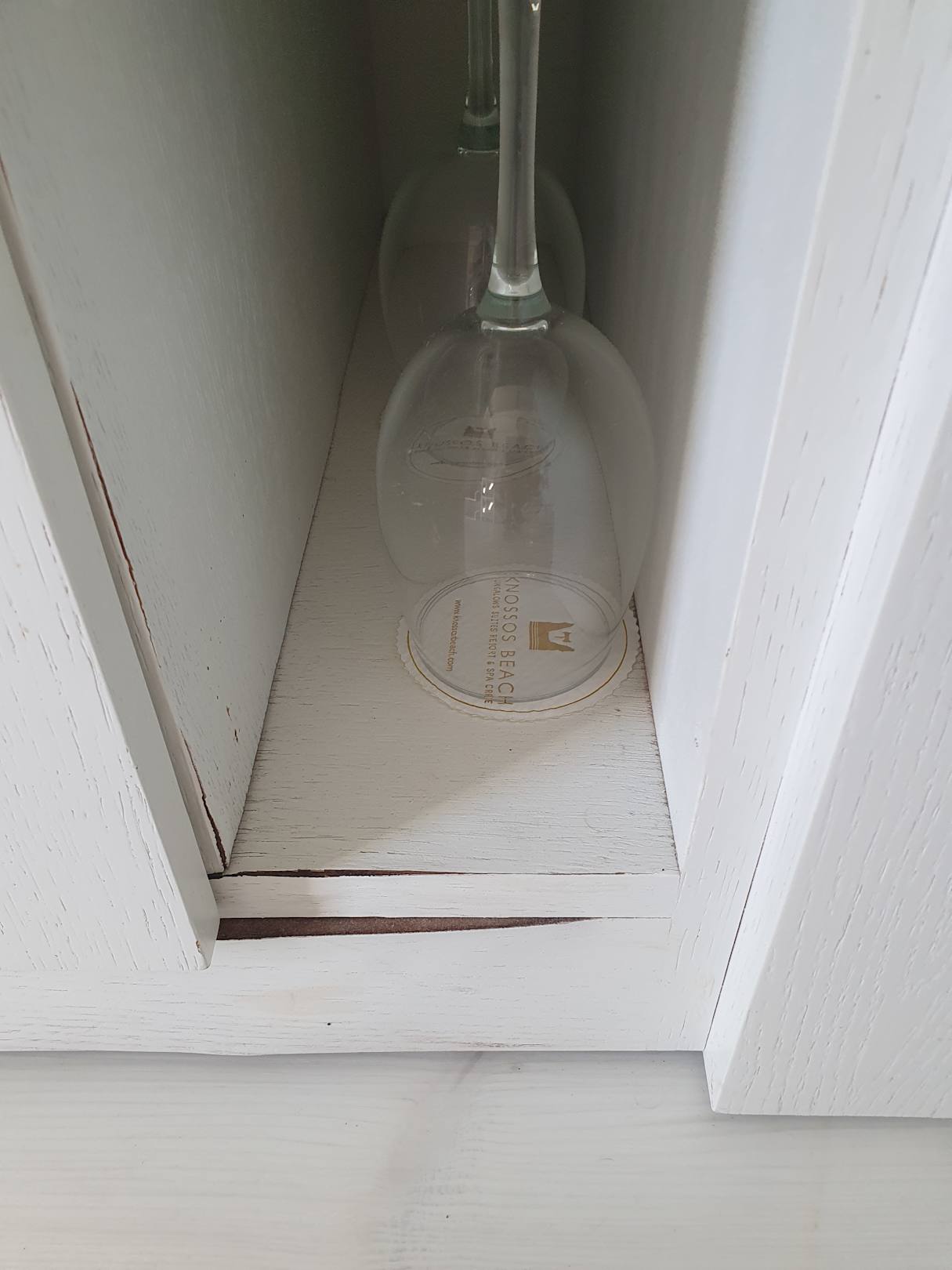 Aufgequollener Schrank in dem Weingläser stehen